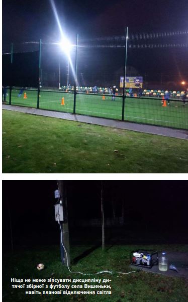 Ще один пункт, який псує життя автомобілісту, і який додався за часів повномасштабного вторгнення – це відключення світла. У темну пору року і за наявності верхнього освітлення на дорозі водії і без того їдуть обережно, не поспішаючи. А коли темінь така, що бачиш метрів зо 30 попереду від світла фар, коли дощить чи падає сніг, маєш зір не 100 %, то пересування автівкою – це уже не задоволення у межах комфорту, а справжнє випробування. Щоправда, і тут трапляються винятки. Якось днями, повертаючись листопадовою мрячкою додому під час відключення у передміський будинок, дорога до якого тягнеться повз кілька сіл поблизу столиці, я аж зупинилася в одному з них від здивування. Серед повної сільської темряви, яку зрідка підсвічувало неяскраве світло від генераторів у магазинах та аварійні світильники подекуди у хатах, я виринула до залитого світлом прожекторів футбольного поля, на якому саме тренувалася дитяча збірна. Я вийшла з автівки, щоб зфоткати це чудо.