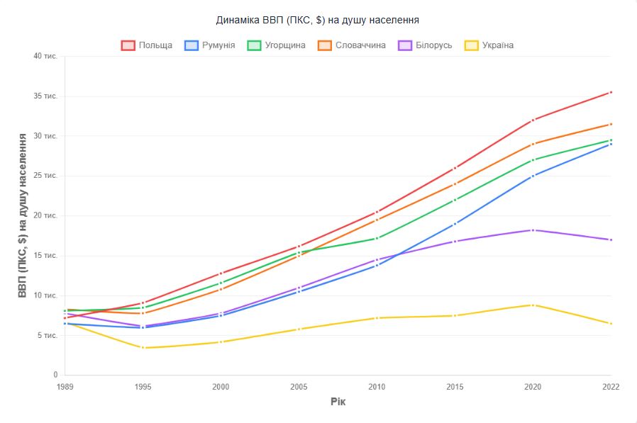 Таким чином, у випадку сусідів України бачимо загальне зростання, яке особливо прискорилось після 2000-2005 років, тобто після входження країн до Євросоюзу, долучення їх до структурних фондів ЄС, правил та спільних ринків.