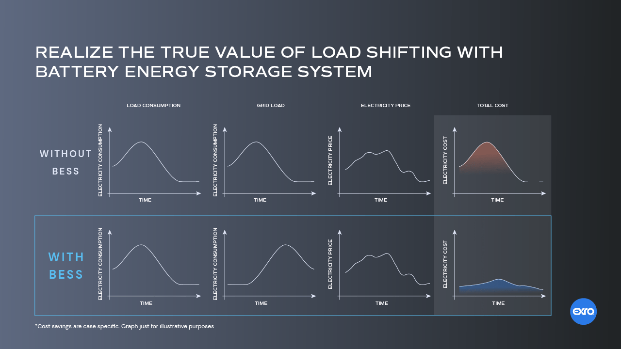 Промислові та комерційні користувачі, які мають акумуляторну Установку Зберігання Енергії, можуть отримати вигоду від Peak Shifting, не змінюючи своїх звичних бізнес-процесів. Наприклад, виробництво може скоротити свої витрати на електроенергію, заряджаючи ESS вночі (тобто в непікові години) і використовувати накопичену енергію протягом дня, коли ціна на електроенергію є найвищою.